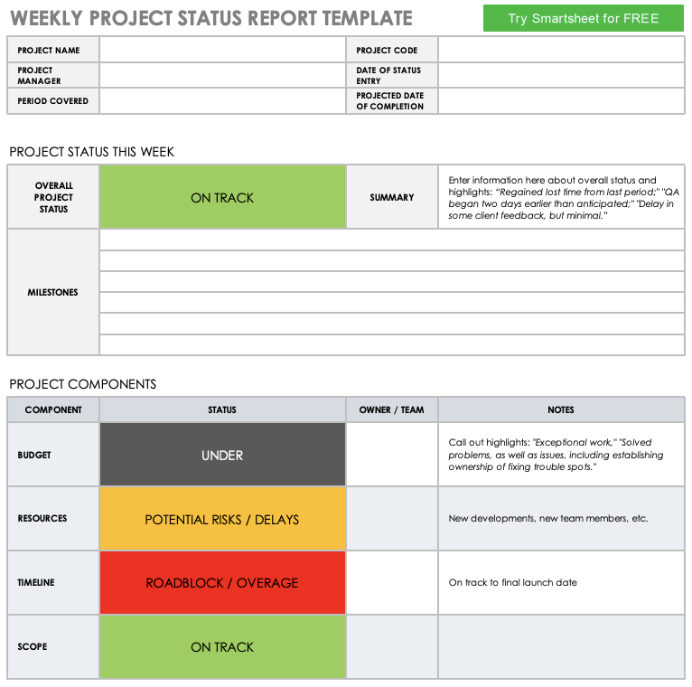 - Overall Status (Red/Yellow/Green): A visual indicator summarizing the project’s health (e.g., On Track (Green), At Risk (Yellow), Off Track (Red)).