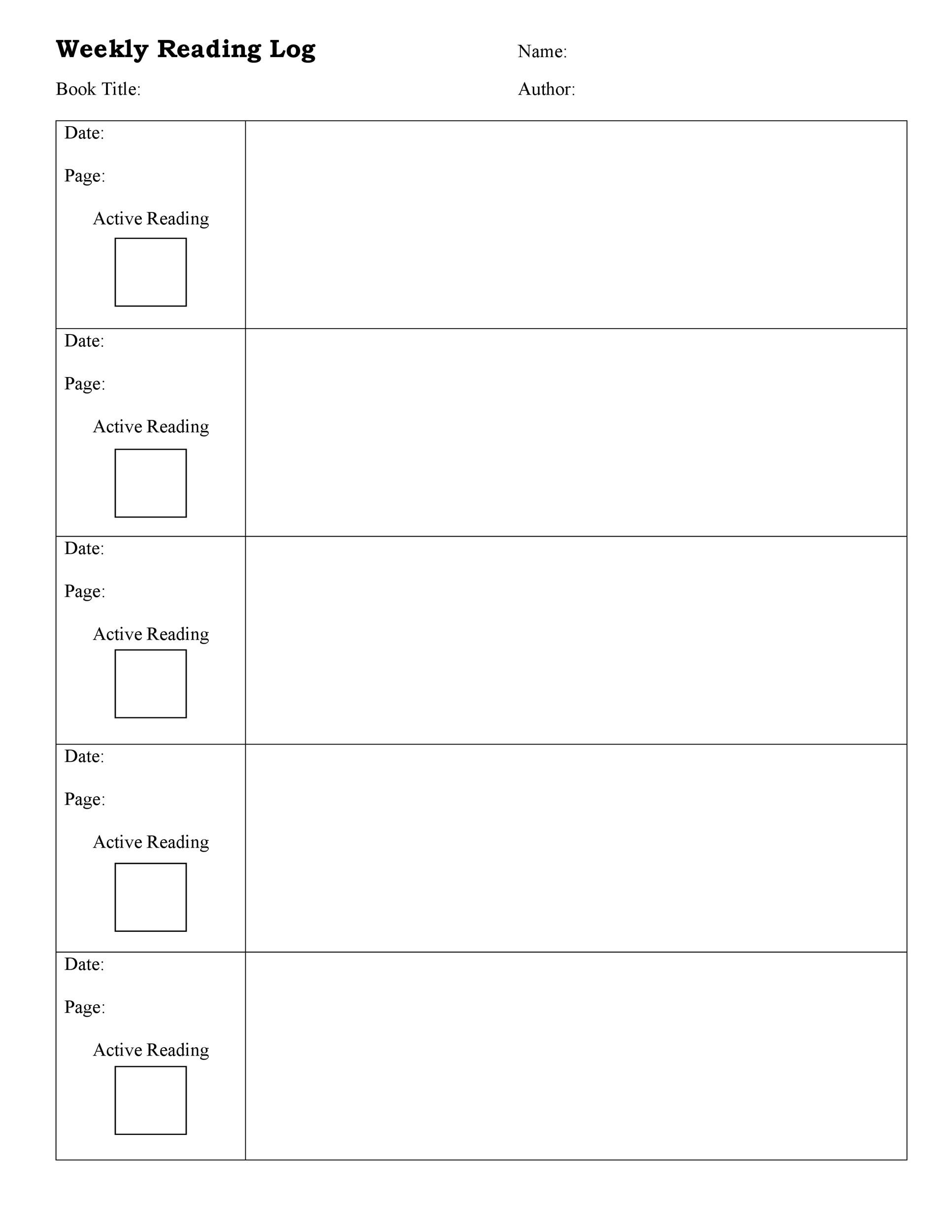 A comprehensive reading log template typically includes the following elements: